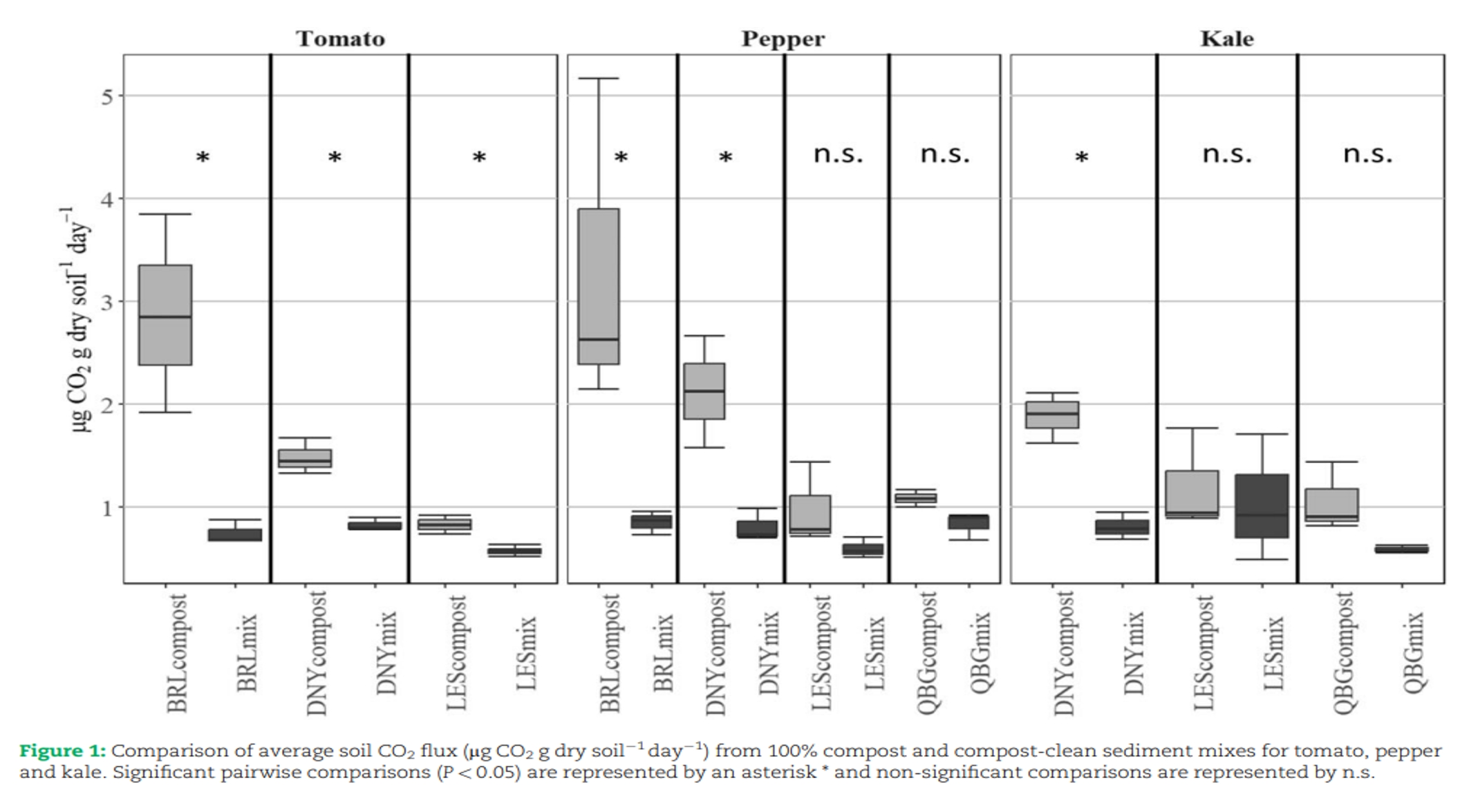 下图为康奈尔大学综合植物科学学院科研人员利用该系统研究了来自纽约不同地方的100%堆肥和50:50堆肥与清洁沉积物混合物添加对番茄、辣椒和羽衣甘蓝土壤CO2通量的影响(J Garcia, N Bray, Y Son, A Butler-Jones, S P Egendorf, J Kao-Kniffin, Plant growth and microbial responses from urban agriculture soils amended with excavated local sediments and municipal composts, Journal of Urban Ecology, Volume 9, Issue 1, 2023)。