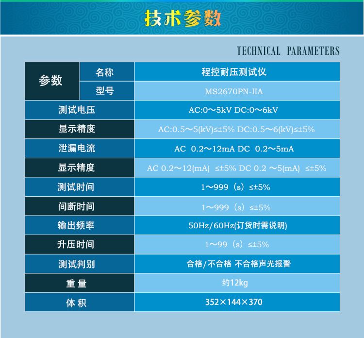 满足IEC60335、UL60335、GB4706.1-2005、GB4943等国内外安规标准测试,符合JJG795-2004、JJG69-2003安规计量检定规程要求。微电脑控制,菜单引导操作,输出电压自动按设定梯度缓升,漏电流上限设定,4组记忆模式,击穿保护,快速切断,拥有RS232接口。