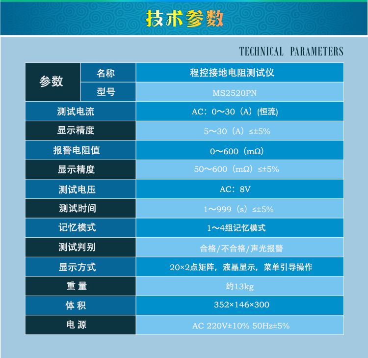 主要功能:测试时间、阻抗、电流同时测量,报警阻值任意预置,合格/不合格声光报警,可扩展RS232接口或PLC接口。