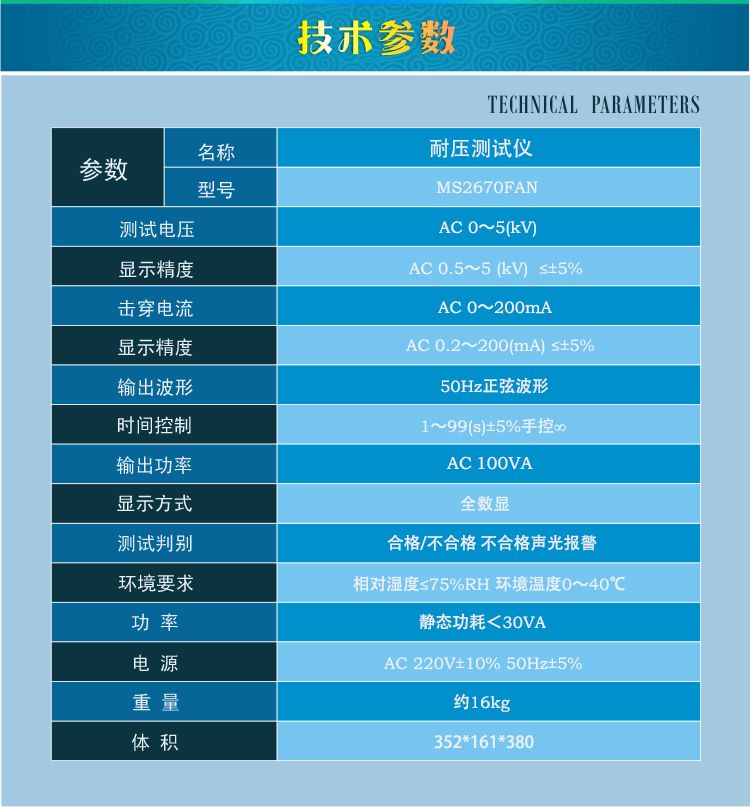 主要功能:手动/自动控制,手动升压,合格/不合格声光报警,击穿保护等功能。