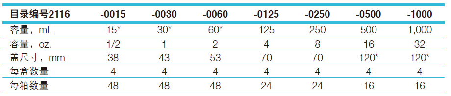 Nalgene直身广口瓶 透明聚碳酸酯材质 带白色PP盖 透明 2116-0250
