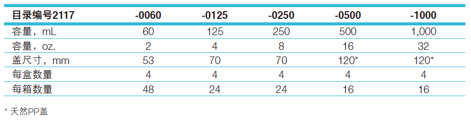 Nalgene 带白色聚丙烯螺纹盖 直身广口瓶 高温高压灭菌 2117-0125
