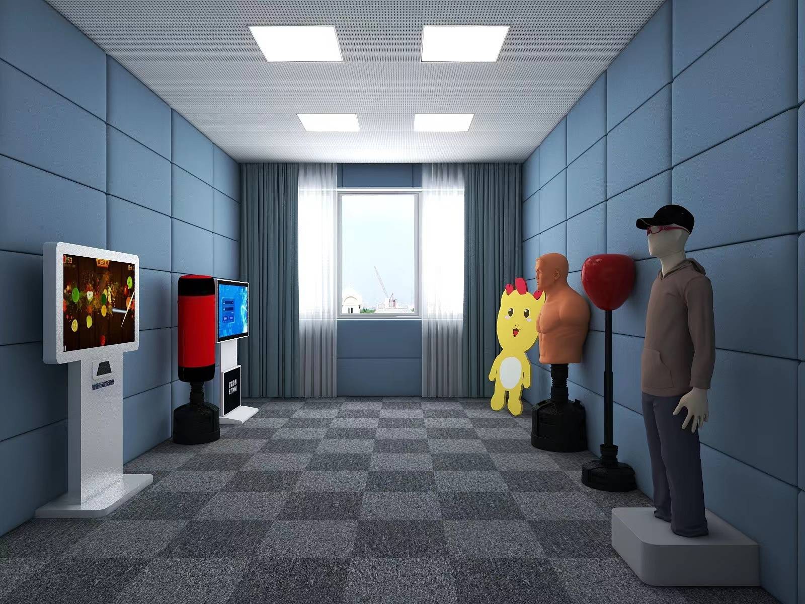 首先映入眼帘的,往往是那一个个栩栩如生的宣泄人。它们有着逼真的人体外形,从外观上看,仿佛就是一个真实可感的倾诉对象。其材质坚固却不失弹性,这种独特的质地使得它们足以承受人们在宣泄情绪时大力的击打、捶打等行为,就像一位默默包容的挚友,无论你如何发泄,它都能稳稳地站在那里。不仅如此,这些宣泄人还极具灵活性,能够依据不同的使用场景,搭配各式各样的服装造型,进一步增强了宣泄时的真实感,让宣泄者更容易沉浸其中,仿佛真的是在与那些给自己带来烦恼的源头进行对抗。更值得一提的是,部分宣泄人还配备了智能语音互动功能呢。当你带着满心的愤懑向它挥出拳头时,它竟会适时地发出鼓励或者引导性的话语,比如“把烦恼都发泄出来吧,你会感觉轻松很多”,这般温暖又贴心的回应,宛如一阵春风,能让宣泄者更加毫无保留地全身心投入到情绪释放的过程当中,尽情地将内心的压抑一吐为快。 而宣泄墙和宣泄柱,同样在这个空间里扮演着不可或缺的重要角色。它们周身被柔软、厚实且环保的材料严严实实地包裹着,这可不单单是为了美观,更重要的是发挥着多重保障作用。一方面,当宣泄者在情绪激动之下,与它们发生碰撞时,这些柔软的“铠甲”能够有效地避免人们受到伤害,成为了保护宣泄者身体安全的坚实屏障;另一方面,它们合围起来,营造出了一种相对封闭、充满安全感的空间氛围,仿佛在告诉每一个走进来的人:“在这里,你可以毫无顾忌,尽情释放内心的愤怒、委屈等所有负面情绪,无需有任何担忧。”在这样的环境里,人们更容易放下心中的顾虑,将那些平日里深埋心底的不良情绪一股脑儿地宣泄出来,让心灵得到一次彻底的减负。
