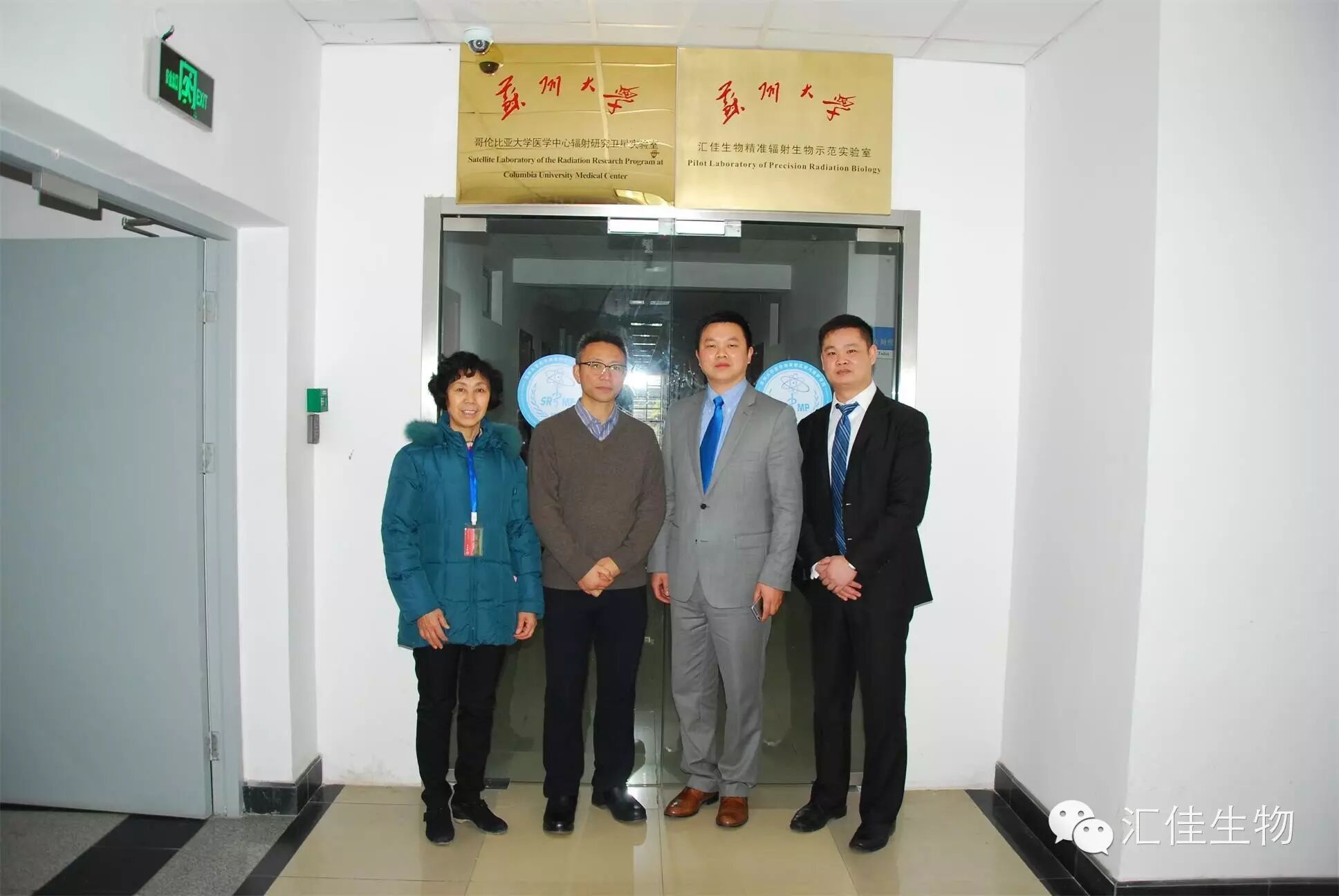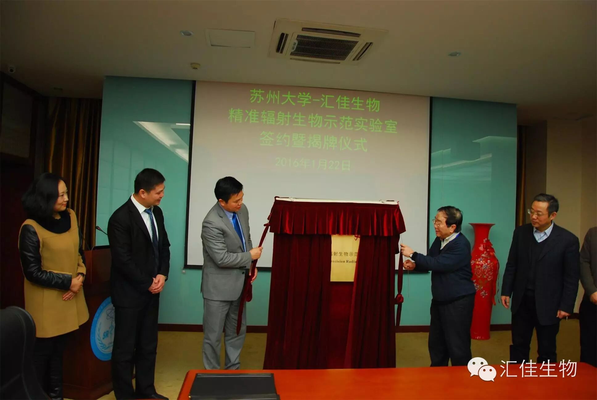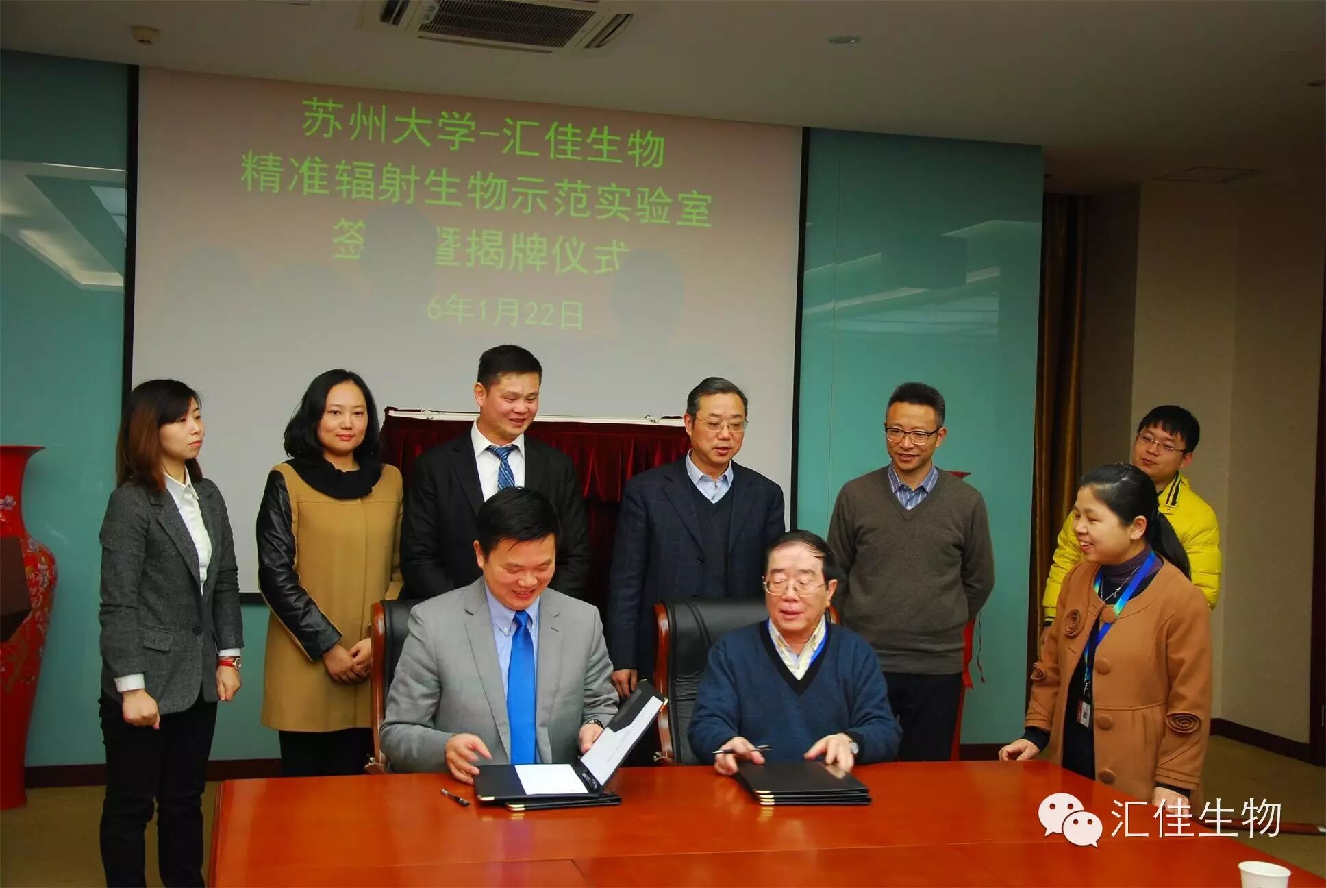 2016年1月22日上午十点整,苏州大学医学部放射医学与防护学院学术会议室,举行了“苏州大学汇佳生物精准辐射生物示范实验室”揭牌仪式。苏州大学医学部放射医学与防护学院院长柴之芳院士和汇佳生物股份(中国)有限公司总裁张阳分别致辞并签署了合作协议。