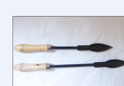 半圆刮刀由T12A工具钢锻打制造而成,后端装有木柄(110mm),刀体部分淬硬到60HRC左右,刃口经过研磨,黑色亮面烤漆。