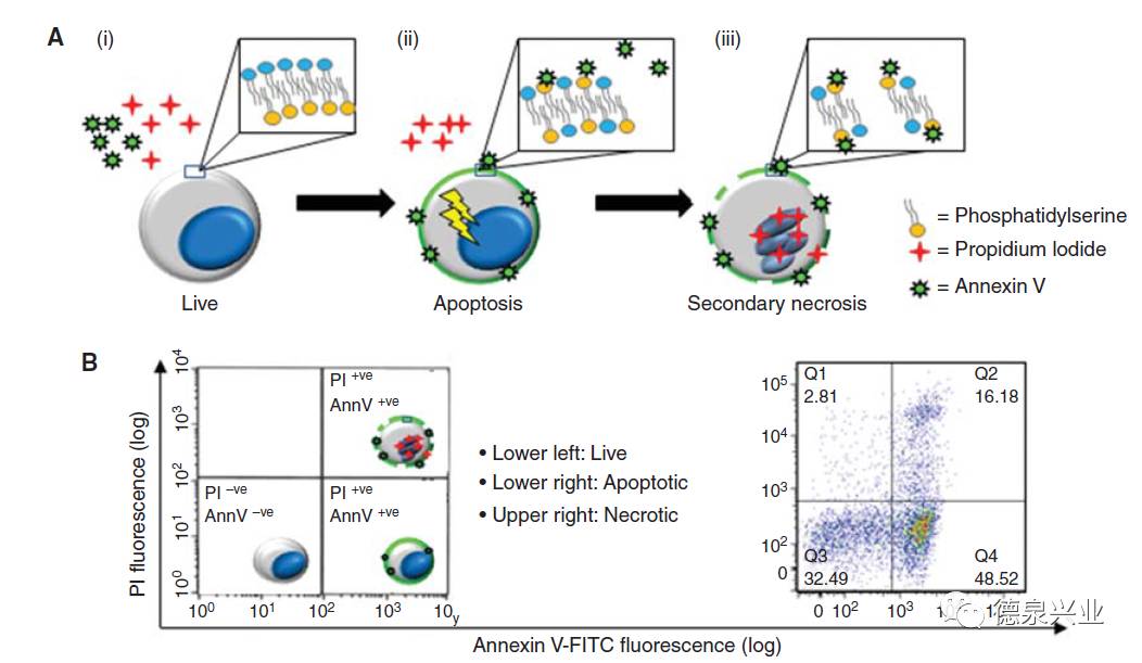 细胞凋亡引起磷脂酰丝氨酸(PS)外翻,在生理条件下PS是供免疫细胞识别引发吞噬避免细胞内物质释放引起炎症反应的!那么在体外培养条件下,没有细胞吞噬凋亡细胞,凋亡细胞何去何从?答案是二级坏死!二级坏死细胞会出现在上图Q2象限!