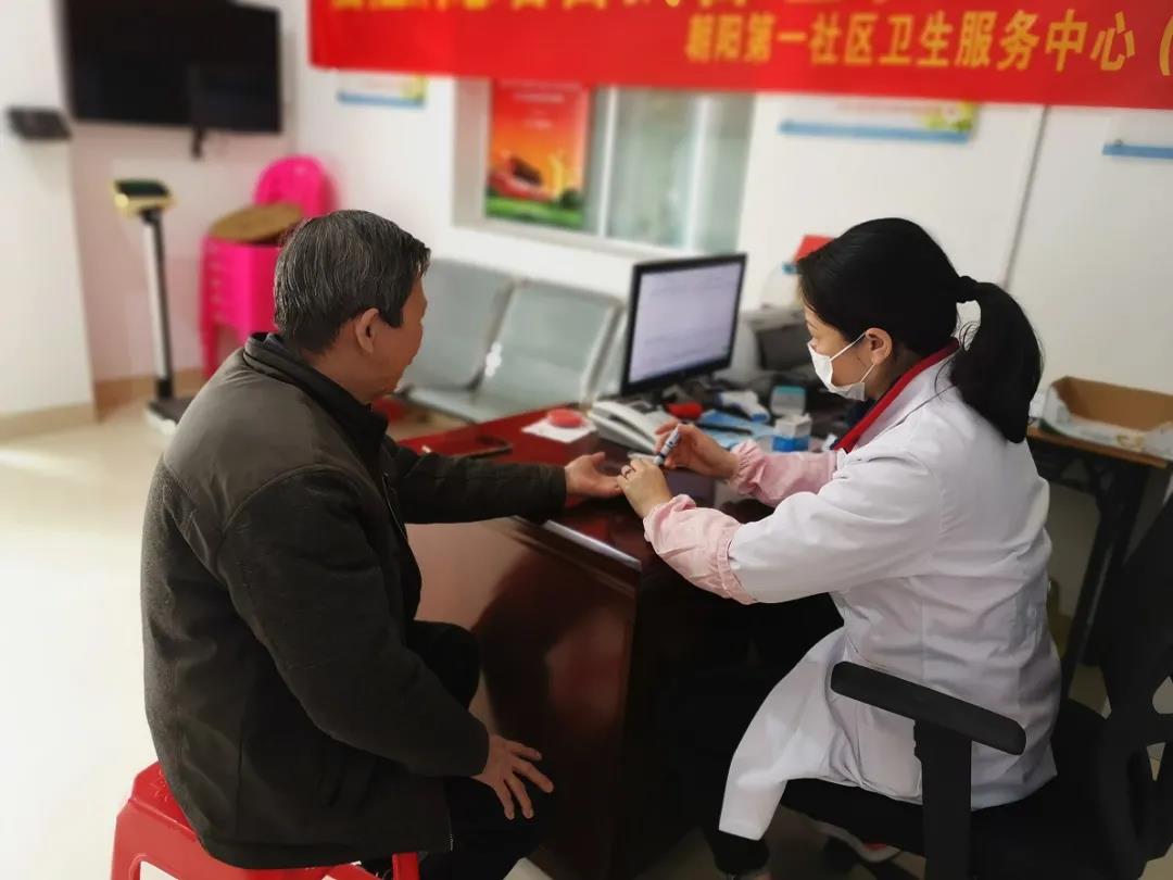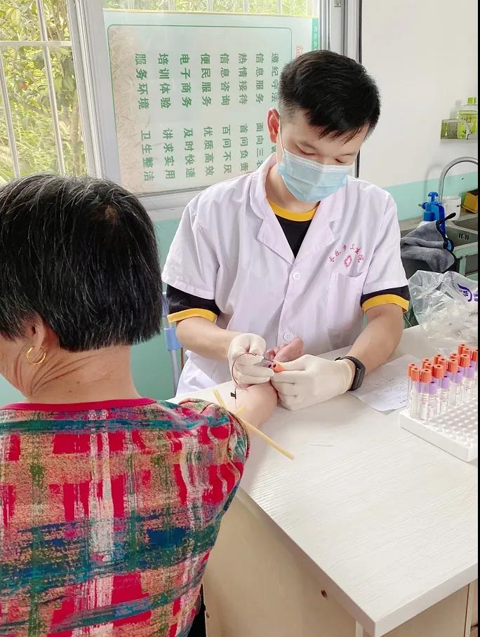 龙文区朝阳镇打山村卫生所吴韶英医生为慢病患者测量血糖