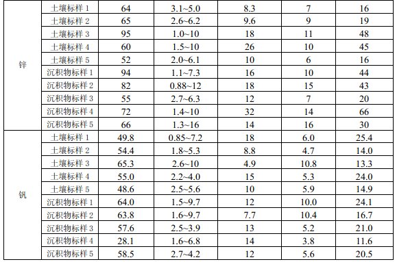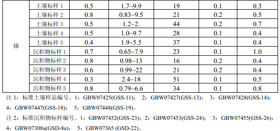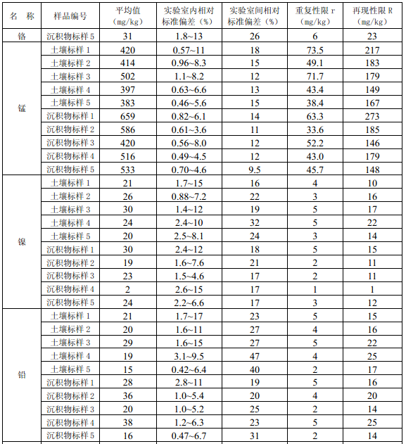6 家实验室分别用电热板消解法和微波消解法对5 种不同含量水平的统一标准土壤样品 和沉积物样品进行测定,电热板消解法的精密度汇总数据见附录 B 中的表 B.1,微波消解法 的精密度汇总数据见附录B 中的表B.2。