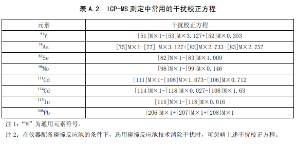 表A.1 给出了 ICP-MS 测定中常见的多原子离子干扰,表A.2 给出了常用的干扰校正方程。