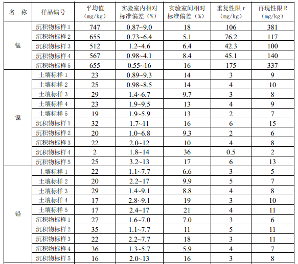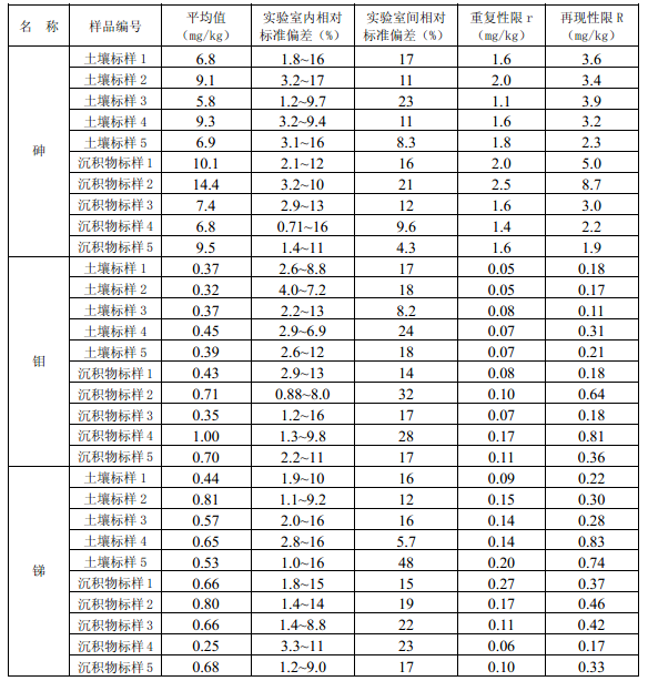 11.3 每批次样品至少按 10% 的比例进行平行双样测定,样品数量少于 10 个时,应至少测 定一个平行双样。平行双样测定结果中,电热板消解测定钴(Co)、铜(Cu)、铬(Cr)、锰 (Mn)、镍(Ni )、铅(Pb)、锌(Zn)、钒(V)、砷(As)的相对偏差应小于 30% ,镉(Cd)、 钼(Mo)、锑(Sb)的相对偏差应小于40% ;微波消解测定 12 种金属元素的相对偏差应小 于30% 。