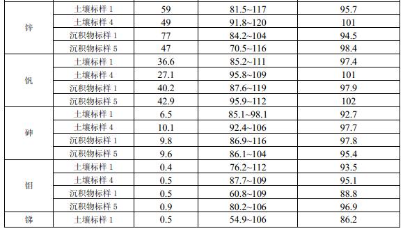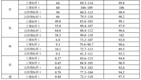 11.4 每批次样品至少分析 10% 的加标回收样,样品数量小于 10 个时,应至少做一个加标 回收样。加标回收样测定结果中,电热板消解测定镉(Cd)、钴(Co)、铜(Cu)、铬(Cr)、 锰(Mn)、镍(Ni )、铅(Pb)、锌(Zn)、钒(V)、砷(As)的加标回收率应控制在 70% ~ 125%之间,钼(Mo)、锑(Sb)的加标回收率应控制在 50% ~125%之间;微波消解测定 12 种金属元素的加标回收率应控制在70% ~125%之间。