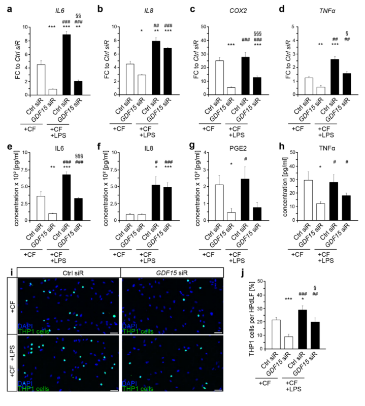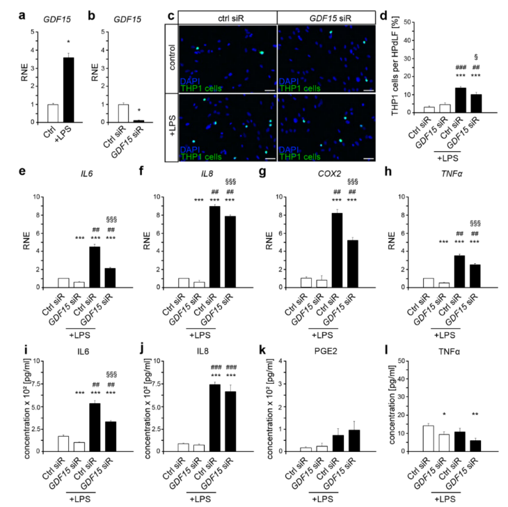 为了进一步分析对THP1激活很重要的炎症信号传导介质的GDF15依赖性变化,实验分别对处理过的HPdLF中的IL6、IL8、COX和TNFα进行了qPCR(图1 f)。LPS刺激诱导了对照siRNA处理的HPdLF中所有细胞因子的上调表达,在GDF15敲低时显著降低。值得注意的是,GDF15缺失细胞在未受到LPS刺激时也显示出IL6、IL8和TNFα的表达减少。然而,转录本分析表明,GDF15在HPdLF的致病性反应中具有促炎作用。为了验证RNA数据,分别分析了受刺激细胞上清液中的细胞因子分泌(图1 i-l)。尽管 PGE2 和 TNFα 分泌保持不变,但 LPS 刺激导致对照组以及 GDF15 siRNA 处理的 HPdLF 中IL6 和 IL8 水平升高。虽然没有检测到IL8分泌中的GDF15依赖性变化,但与相应的对照组相比,GDF15缺失的HPdLF中IL6的增加显著降低。这些数据表明,GDF15在HPdLF对致病刺激的反应中具有促炎作用,这似乎取决于IL6信号传导。