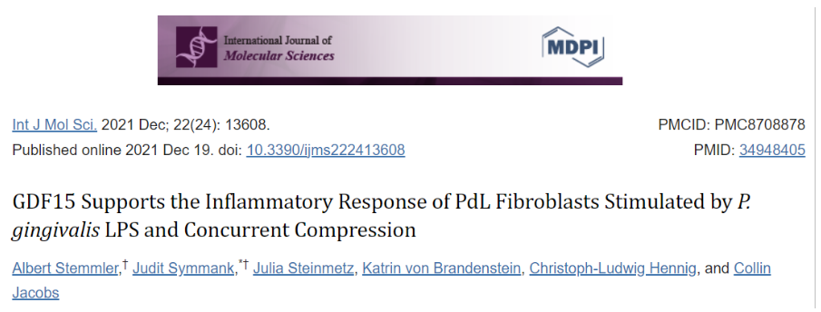 对包括 P. gingivalis 在内的多微生物感染小鼠进行的研究表明,PdL组织中Gdf15的表达增加。然而,GDF15是否有助于调节PdL成纤维细胞对 P. gingivalis 炎症的反应仍然未知。此外,目前还没有研究调查GDF15在力刺激的HPdLF增强炎症反应中的作用,这种炎症反应通常发生在P. Gingivalis -LPS并发感染中。因此,德国耶拿大学附属医院口腔正畸科课题组的一项研究的目的是(1)研究GDF15在体外HPdLF对P. Gingivalis -LPS的炎症反应中的作用,以及(2)揭示当这些细胞额外加载压缩力时GDF15的依赖性变化。
