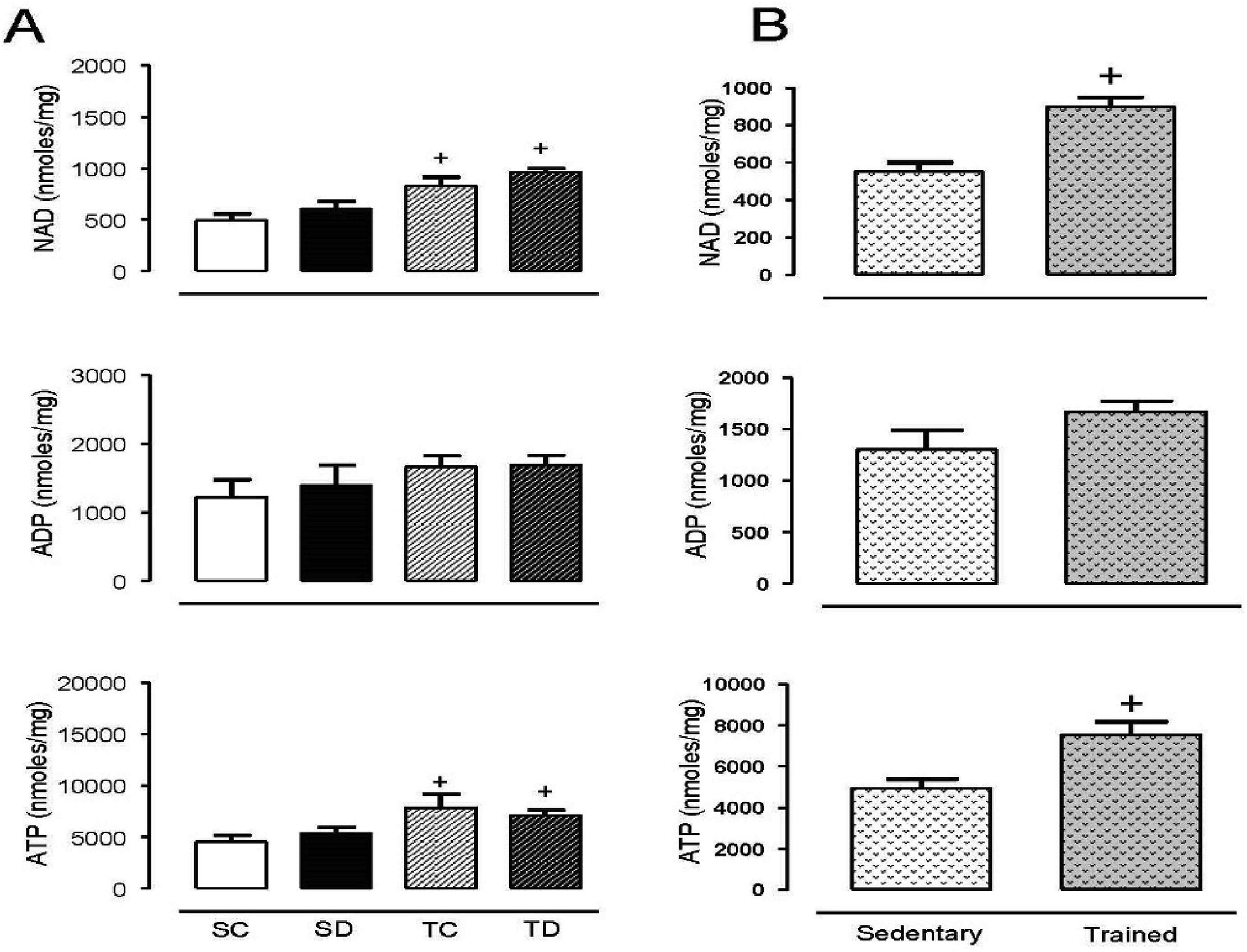 为了研究NAD依赖性过程对Dex的高血压机制和骨骼肌血管减少的影响,对一组大鼠进行了如前所述的运动方案。实验证实了久坐不动的非训练动物血压升高,而训练组的血压变化减弱。实验还确认了久坐组的胫骨前部(左腿)血管丢失,而训练组的运动训练防止了血管的缺失(图1)。Dex的药理作用还表现为体重减轻和肾上腺萎缩。同一动物的右腿胫骨前部被用于量化二磷酸吡啶核苷酸(NAD)组织水平,与未经训练的久坐组相比,运动训练的动物对照组和Dex治疗组的NAD组织水平显著增加(图2)。此外,三磷酸腺苷(ATP)而不是二磷酸腺苷(ADP)水平遵循相同的趋势,表明有氧运动训练可以增强肌肉代谢能力。然而,Dex并没有改变久坐组骨骼肌中的NAD水平,这表明Dex诱导的血管效应不太可能是由于NAD 依赖过程或能量水平的变化。