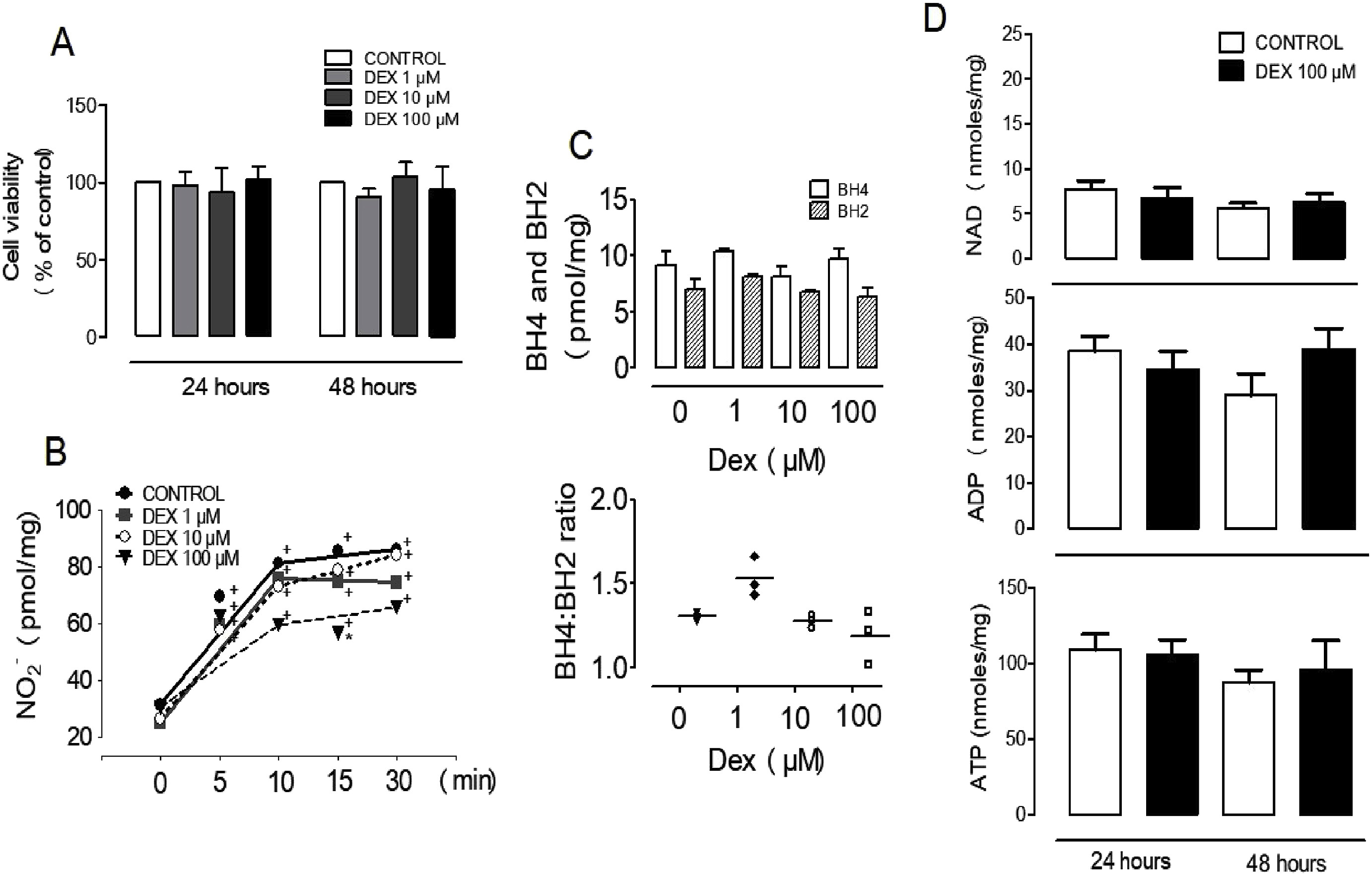 为了研究Dex诱导的体内高血压是否与内皮细胞功能障碍和死亡增加有关,实验分析了细胞存活和NO产生。内皮细胞用浓度为1-100 μM的Dex处理24小时和48小时后,内皮细胞活力没有变化(图3)。此外,在24小时或48小时治疗后,NAD,ADP或ATP水平没有变化。