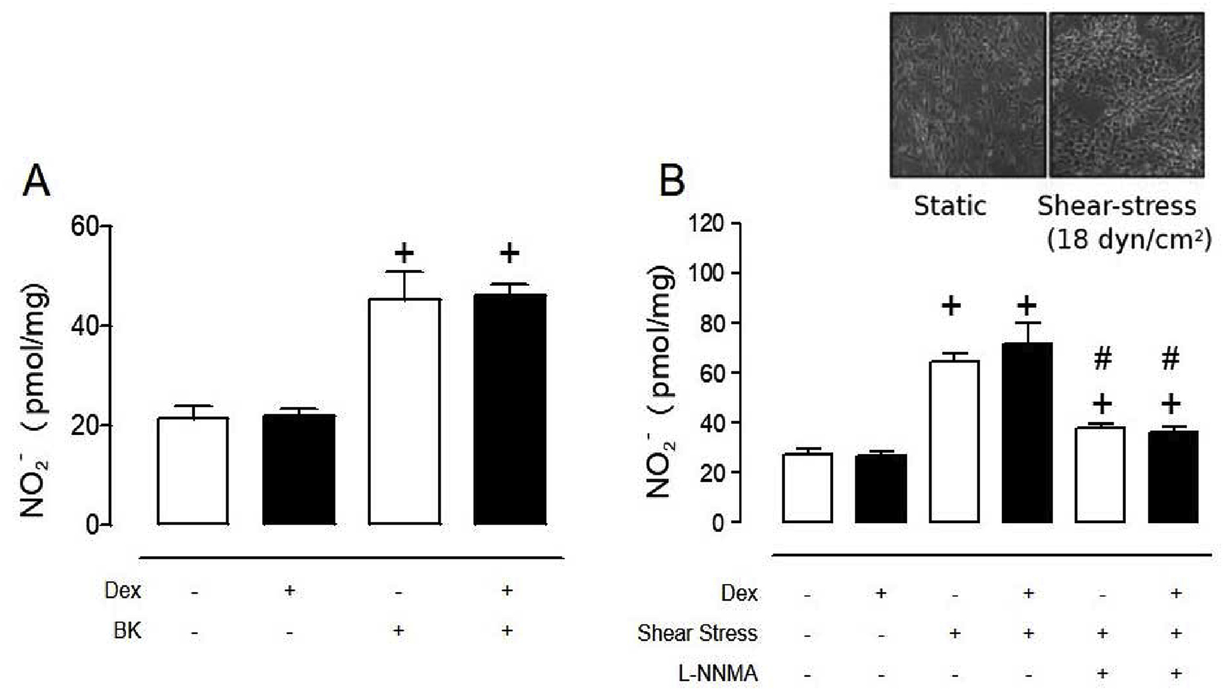 流体剪切应力刺激内皮细胞是增加NO产生的一种公认的生理机制。为了在体外模拟这种刺激,内皮细胞暴露于18 dyne/cm2 的机械应力下4小时。在该实验环境中,通过L-NMMA(总NOS抑制剂)抑制流动刺激细胞中NO的产生来确定eNOS的激活。在存在或不存在Dex的情况下,在静态培养中检测到的基础NO明显低于剪切力刺激的细胞,比注射缓激肽30分钟后检测到的基础NO高约30%(图4 B)。L-NMMA将NO积累降低到在静态条件下检测到的相似水平(图4 B)。
