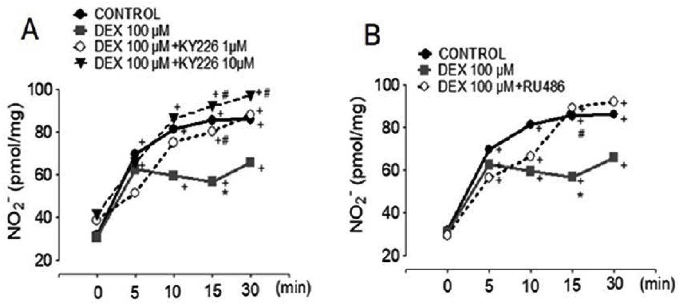 (A)KY226剂量依赖性拯救Dex(100 μM,24小时)依赖性NO还原。(B)GR抑制剂(RU486,10 μM)在Dex(100μM,24小时)处理的细胞中重新建立NO释放。