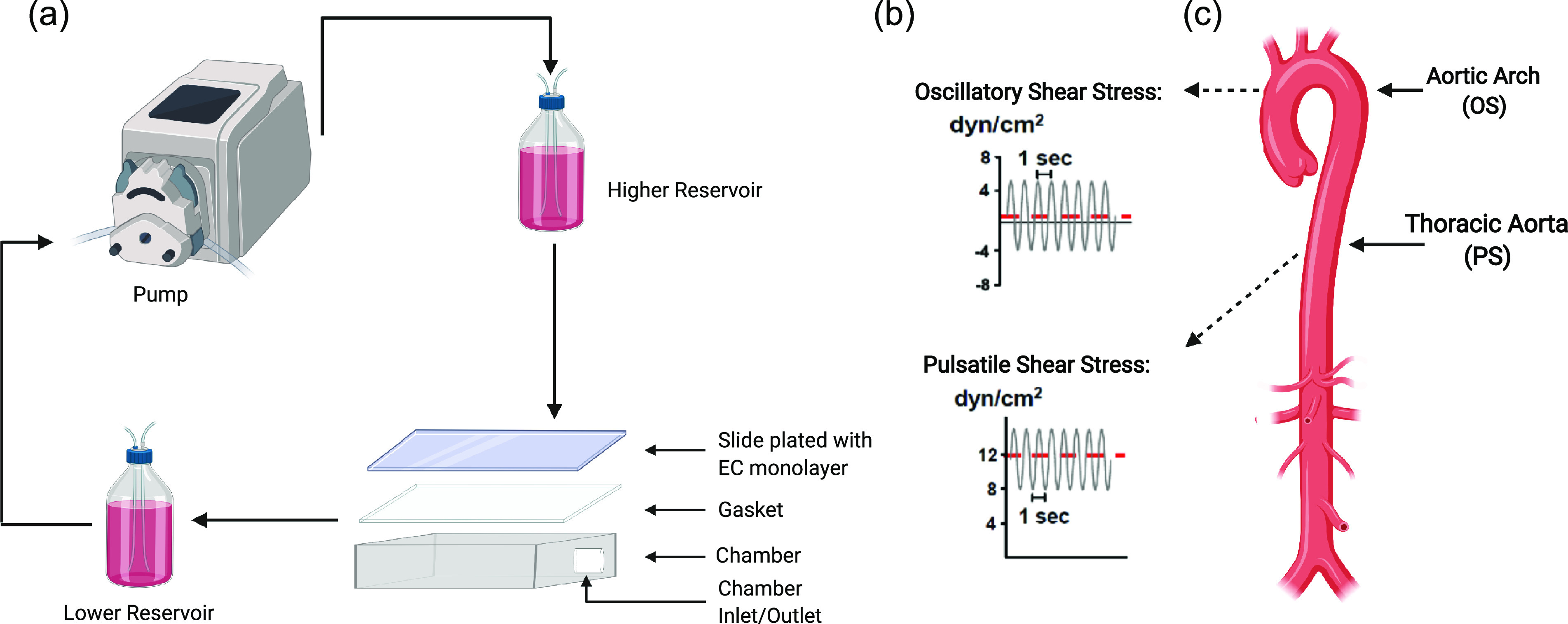 (a)图表说明了用于体外将PS或OS应用于ECs的可灌注流动系统。(b)灌注系统施加剪切应力,脉动方向为 12 ± 4 dynes/cm2,最小大小为 0.5 ± 4 dynes/cm2。(c)用主动脉弓标注的主动脉,该区域以OS模拟的扰动流动模式为特征,胸主动脉以PS模拟的层流模式为特征。
