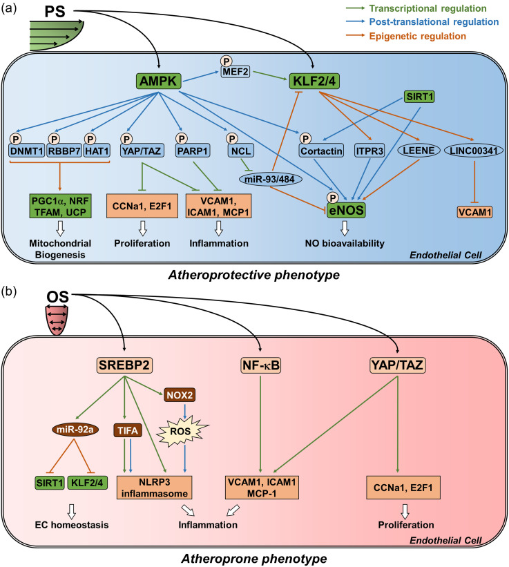 (a)PS对ECs影响的网络示意图。PS激活AMPK、KLF2和KLF4。AMPK通过磷酸化DNMT1、RBBP7、HAT1、YAP/TAZ、PARP1、NCL和皮质激素,起到动脉粥样硬化保护作用。KLF2通过转录诱导ITPR3、LEENE和LINC00341发挥类似的动脉粥样硬化保护作用。这些靶点的活性被调节以增强线粒体的生物发生和功能,增加eNOS衍生的NO生物利用度,并减少EC增殖和炎症。(b)OS对ECs影响的网络示意图。OS激活SREBP2,YAP / TAZ和NF-κB,共同损害EC稳态,并增强EC炎症和增殖。