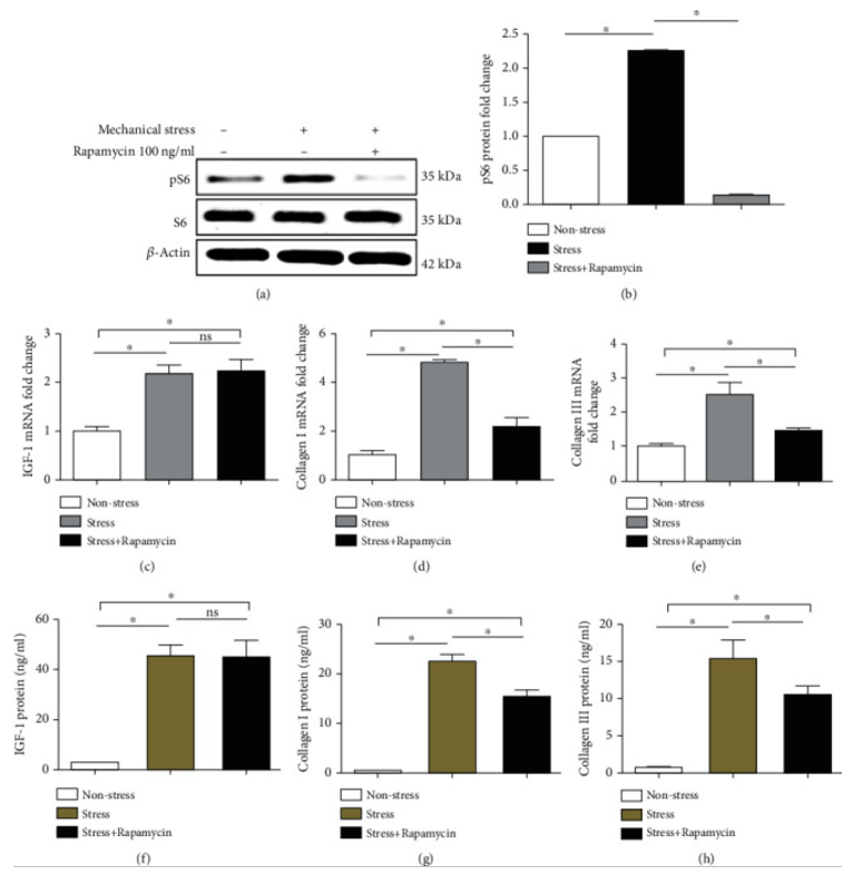 雷帕霉素降低了col-I(d)和col-III(e)的mRNA水平,但没有降低IGF-1(c)的水平。雷帕霉素降低了col-I(g)和col-III(h)的蛋白质水平,但没有降低IGF-1(f)的蛋白质水平。此外,雷帕霉素降低了pS6(a,b)的活化。