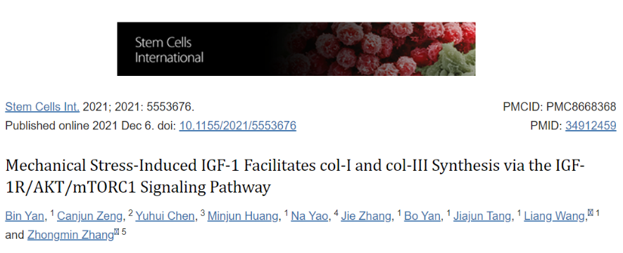 参考文献:Yan B, Zeng C, Chen Y, Huang M, Yao N, Zhang J, Yan B, Tang J, Wang L, Zhang Z. Mechanical Stress-Induced IGF-1 Facilitates col-I and col-III Synthesis via the IGF-1R/AKT/mTORC1 Signaling Pathway. Stem Cells Int. 2021 Dec 6;2021:5553676. doi: 10.1155/2021/5553676. PMID: 34912459; PMCID: PMC8668368.