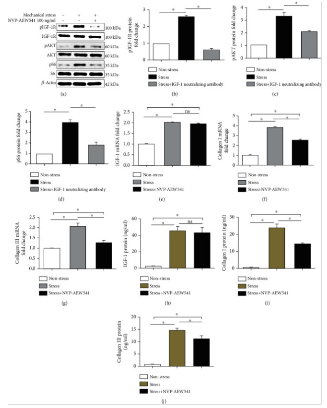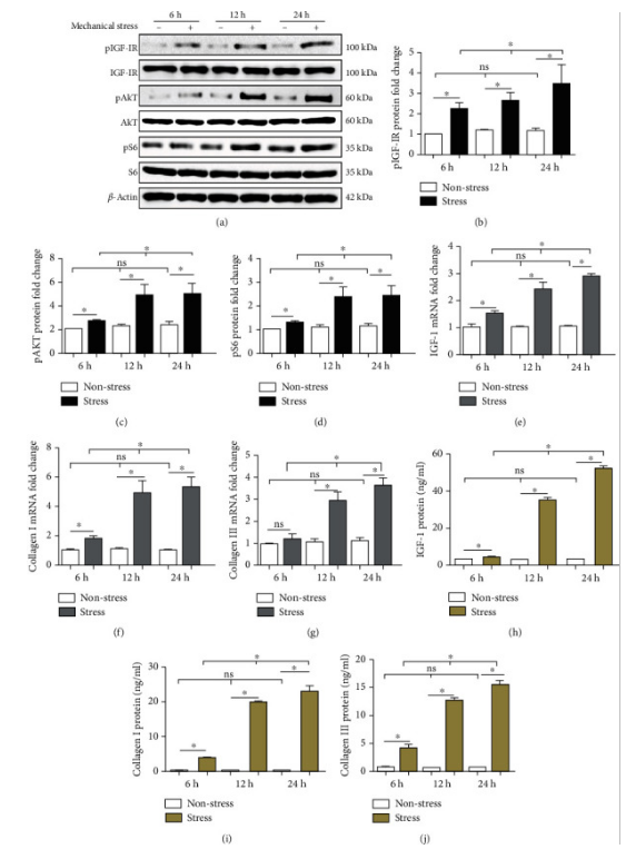然后,在应力组和非应力组中通过RT-qPCR在6 h、12 h和24 h检查IGF-1,col-I和col-III的 mRNA。结果表明,机械应力以时间依赖性方式上调IGF-1,col-I和col-III mRNA的产生(图2 e-g)。此外,通过ELISA在6 h、12 h和24 h检查IGF-1,col-I和col-III的蛋白水平。结果表明,机械应力以时间依赖性方式增加IGF-1,col-I和col-III蛋白的产生(图2 h-j)。在应力组和非应力组中,通过蛋白质印迹分析在6 h、12 h和24 h评估pIGF-1R、pAKT和pS6的激活情况。结果表明,机械应力以时间依赖性方式增加pIGF-1R(图2 a、b)、pAKT(图2 a、c)和 pS6(图2 a、d)的激活。