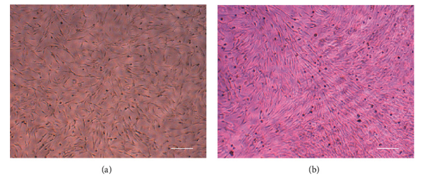 (a)LFCs在没有机械应力的情况下培养。(b)使用细胞牵拉系统对实验组细胞施加周期性牵拉应力,以20% 的牵拉强度牵拉黄韧带细胞 10 s,然后停止牵拉10 s。