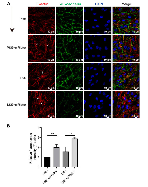 (A)免疫荧光图像显示了由LSS刺激和有或没有Rictor siRNA转染的肌动蛋白丝(F-肌动蛋白)的极性。(B)测量F-肌动蛋白的平均荧光强度。