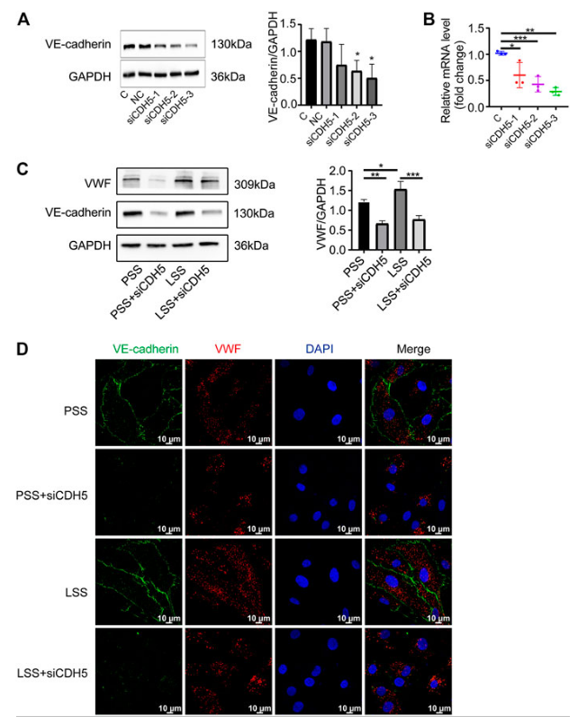 (A)代表性图像显示VE-钙粘蛋白(CDH5)的敲低。C和NC分别代表对照组和阴性对照组。(B)PCR检测CDH5敲低效率。(C)VWF蛋白的表达是在不同类型的剪切应力和有或没有siCDH5 siRNA转染下通过免疫印迹检测的。(D)免疫荧光图像显示VE-钙粘蛋白下调降低了VWF表达。