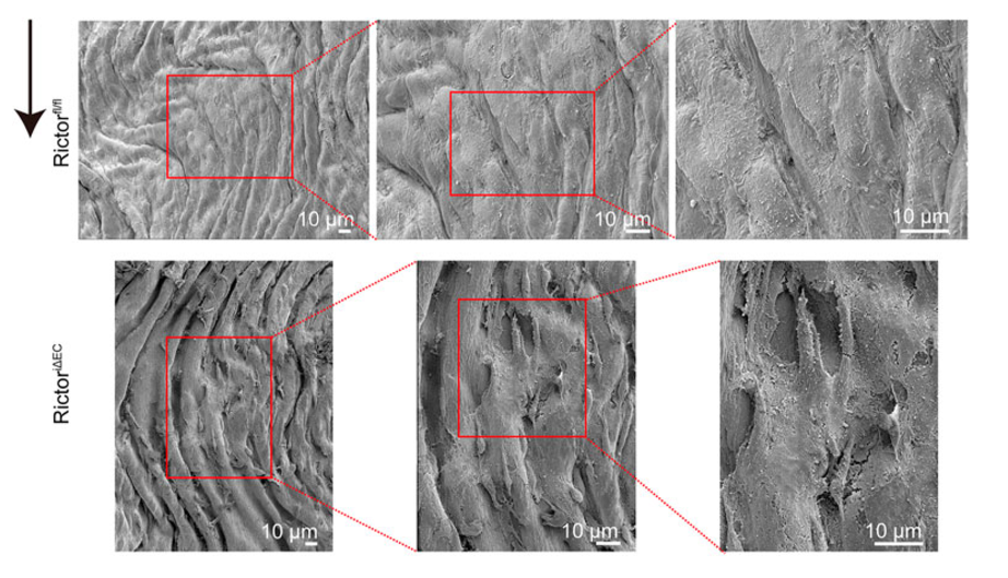图像显示Rictorfl/fl (上)和 RictoriΔEC (下)小鼠胸主动脉内皮的形态。从左到右的红色框区域是局部放大区域,黑色箭头表示流向。