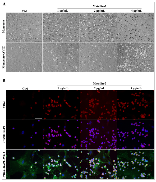 接下来检查了Matrilin-2刺激后单核细胞对AVICs的粘附(图2 A)。在暴露于Matrilin-2的共培养物中,单核细胞改变了它们的形态(大小和形状),并对AVICs表现出更大的粘附性。然而,Matrilin-2对单独培养的单核细胞没有显著影响。图2 B中的免疫荧光图像证实,共培养中的Matrilin-2刺激改变了单核细胞的形态并增加了它们对AVICs的粘附。这些观察结果表明,单核细胞在用Matrilin-2刺激时粘附于AVICs上。