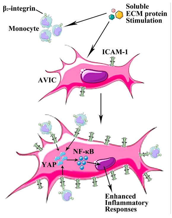 该研究结果表明,可溶性ECM蛋白诱导单核细胞与AVICs的相互作用,增强AVIC炎症活性。单核细胞β2-整合素和AVIC ICAM-1的相互作用导致AVICs中YAP和NF-κB的激活,这是对内源性促炎因子的炎症反应增强的原因(图4)。这些新发现强调了浸润单核细胞通过与AVIC的细胞间相互作用在增加主动脉瓣炎症中的作用,并指出了抑制瓣膜炎症引起的CAVD进展的潜在靶点。