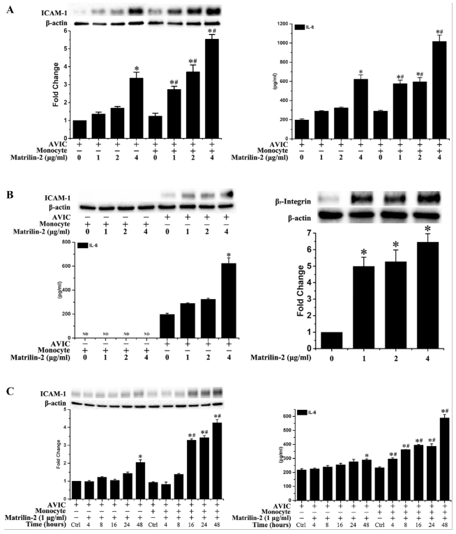 单核细胞β2-整合素通过ICAM-1增强Matrilin-2诱导的AVICs促炎信号和炎症反应