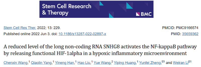 参考文献:Wang C, Yang Q, Han Y, Liu H, Wang Y, Huang Y, Zheng Y, Li W. A reduced level of the long non-coding RNA SNHG8 activates the NF-kappaB pathway by releasing functional HIF-1alpha in a hypoxic inflammatory microenvironment. Stem Cell Res Ther. 2022 Jun 3;13(1):229. doi: 10.1186/s13287-022-02897-x. PMID: 35659362; PMCID: PMC9166574.