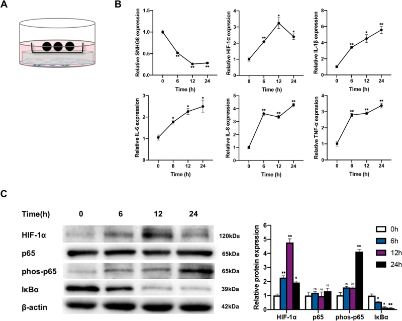 细胞受到静态压缩力 0、6、12、24 h。(A)施加的压缩力。(B)qRT-PCR结果显示,施加力后PDLCs中SNHG8、HIF-1α、IL-1β、IL-6、IL-8和TNF-α的mRNA表达。(C)施加力后 HIF-1α、p65、phos-p65 和 IκBα 的蛋白质印迹分析。