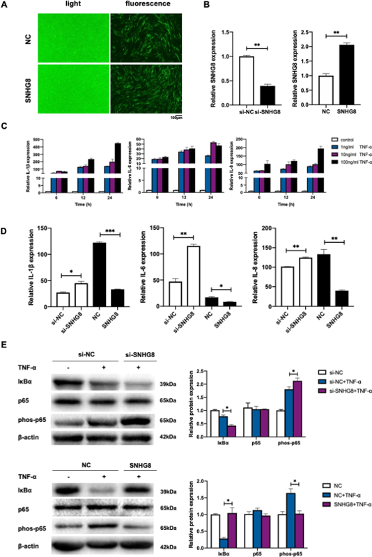用针对 SNHG8 的小干扰 RNAs(si-SNHG8)、siRNA 对照(si-NC)和含有全长 SNHG8(SNHG8)的重组荧光标记慢病毒以及对照(NC)转染细胞,以敲低或过表达其表达。(A)荧光显微镜显示 NC 组和 SNHG8 组 PDLC 的转染效率。(B)qRT-PCR结果显示SNHG8敲低组和过表达组的相对SNHG8表达。(C)qRT-PCR结果显示TNF-α刺激后IL-1β、IL-6和IL-8的mRNA表达。(D)qRT-PCR结果显示,在TNF-α刺激下,SNHG8被敲低或过表达后,IL-1β、IL-6和IL-8的相对RNA表达。(E)蛋白质印迹分析显示 SNHG8 敲低或过表达对 PDLCs 中 TNF-α 诱导的 NF-κB 通路激活的影响。