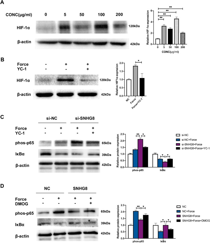 (A)DMOG刺激后PDLC中HIF-1α的蛋白质印迹分析。(B)在PDLC中施加力和YC-1刺激后HIF-1α的蛋白质印迹分析。(C)有或没有SNHG8敲低,有或没有YC-1刺激下施加压缩力后phos-p65和IκBα的蛋白质印迹分析。(D)有或没有 SNHG8 过表达,有或没有 DMOG 刺激下在 PDLC 中施加压缩力后 phos-p65 和 IκBα 的蛋白质印迹分析。