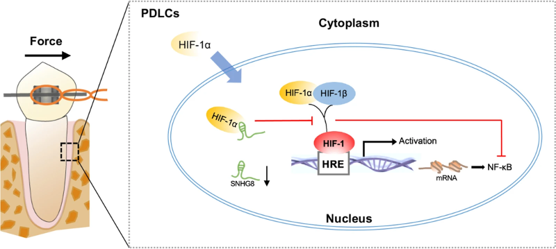图4 示意图显示,在 PDLCs中,SNHG8 与 HIF-1α 结合,并在正畸压缩力下显著下调。功能性 HIF-1α 增加以促进下游转录活性,从而激活 NF-κB 通路。