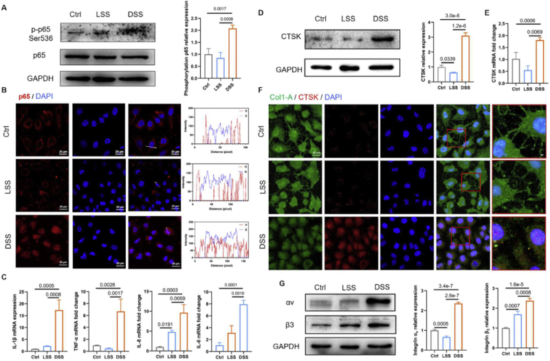 通过Western blot检测CTSK在暴露于不同流动条件的HUVECs中的表达,结果表明,DSS显著提高了HUVECs中CTSK的水平(图2 D),与体内模型的结果一致。qRT-PCR结果进一步证实,DSS显著增强了CTSK的mRNA表达(图2 E)。I型胶原是CTSK的底物,CTSK可使I型胶原蛋白的三螺旋结构断裂。在静态对照组和LSS组I型胶原纤维明显突出,而DSS组的CTSK水平高,I型胶原纤维明显减少(图2 F)。这些结果表明,DSS可以促进CTSK的表达并降解基质,最终导致血管重塑。此外,发现DSS组整合素αv和β3的表达明显高于LSS组或静态对照组(图2 G)。综上所述,DSS可诱导内皮炎症和ECM再分布,并伴有高水平的CTSK和整合素αvβ3表达。