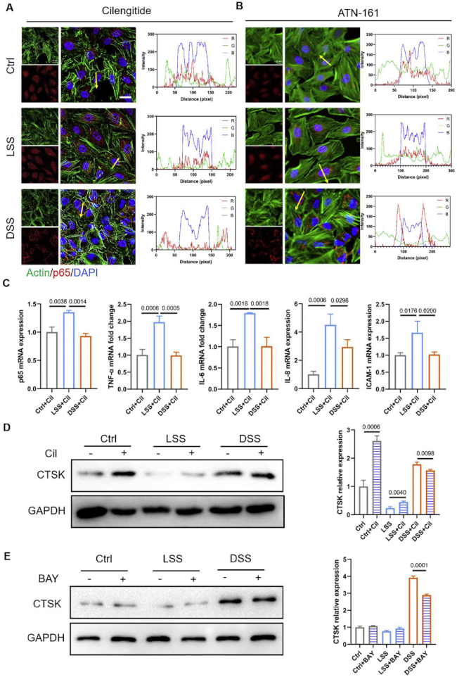进一步地,实验想要阐明整合素如何介导剪切诱导的动脉粥样硬化变化。上述结果表明,DSS诱导p65,在西仑吉肽(整合素αvβ3的特异性抑制剂)和ATN-161(整合素α5β1抑制剂)存在下,可以重新分布到细胞质,这表明内皮炎症可以通过抑制整合素完全减弱。通过使用西伦吉肽或ATN-161,可以发现肌动蛋白纤维没有明显差异(图3 A、B)。