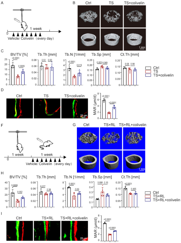 为了进一步研究colivelin是否可以在没有运动的情况下维持骨稳态,建立了TS模型(图4 A)。与TS小鼠相比,colivelin处理的TS小鼠小梁骨的BV/TV和Tb.N. 显著升高(图4 B、C),这意味着colivelin可以相对挽救骨质流失,且MAR增加,表明colivelin在运动损失下促进骨形成(图4 D)。这些结果充分说明,STAT3的药理激活可用于预防因运动缺失引起的骨质疏松症。