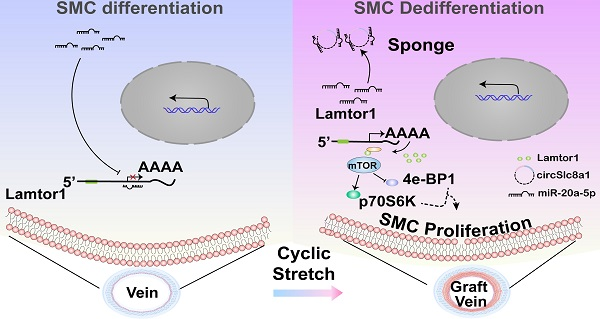 这些结果表明,动脉机械张应变诱导circSlc8a1和随后的Lamtor1的表达,参与静脉SMCs的去分化和增殖,并可能参与了静脉移植过程中的血管重塑。