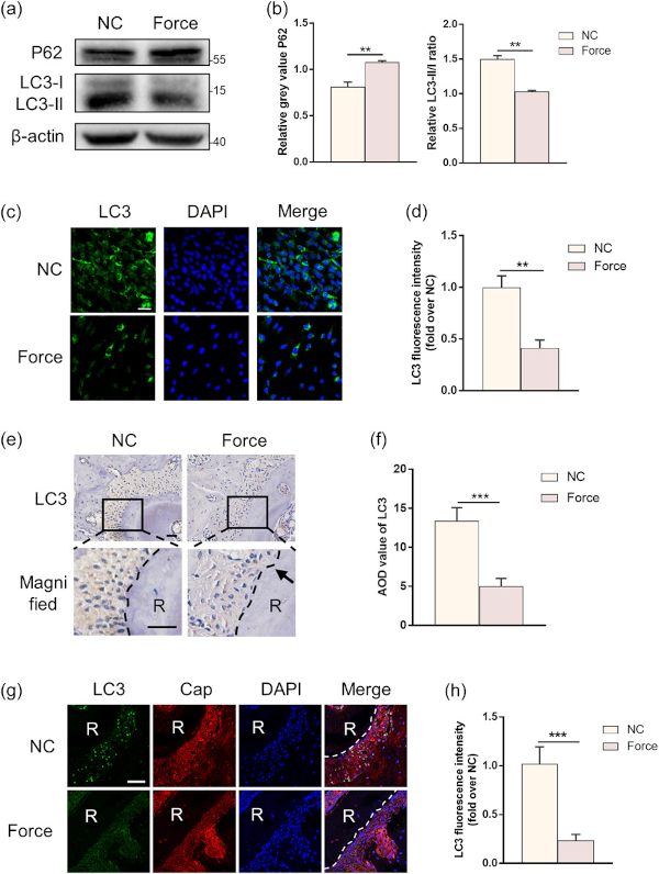 为了评估压缩力对成牙骨质细胞自噬的影响,检测了自噬的两个标志物,即自噬受体 P62 的表达和 LC3-I 向 LC3-II 的转化。蛋白质印迹分析表明,压缩力增加了成牙骨质细胞中P62的表达,但降低了LC3-I向LC3-II的转化(图1 a、b)。此外,在受压缩力刺激的细胞中,自噬体阳性LC3的形成显著减少(图1 c、d),这表明压缩力抑制了成牙骨质细胞的自噬活性,且压缩力导致成牙骨质细胞受压侧 LC3 显著下调(图1 e、f)。位于牙根表面的Cap+ 细胞上的LC3染色证实,在压缩力作用下,LC3+ 成牙骨质细胞较少(图1 g、h)。