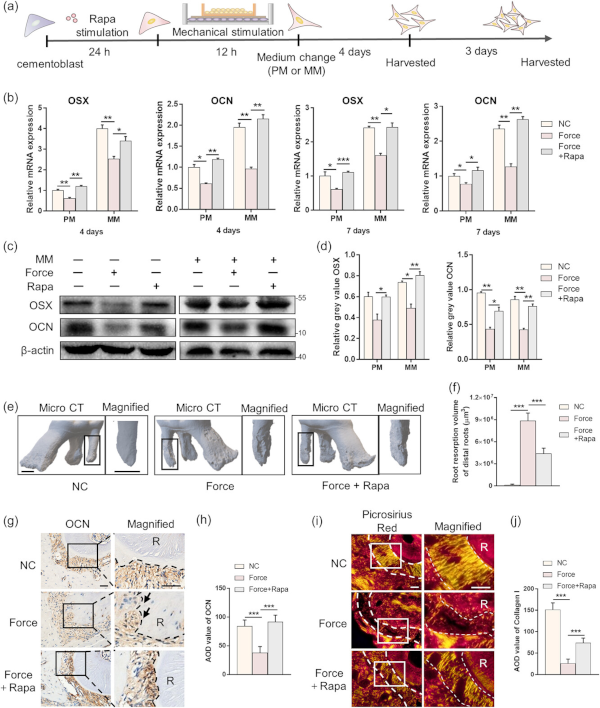 然后实验试图确定压缩力是否通过自噬调节成牙骨质细胞矿化,用Rapa预处理成牙骨质细胞,然后暴露于压缩力(图2 a)。在PM和MM组中,Rapa挽救了压缩抑制的矿化相关基因OSX和OCN的表达(图2 b)。蛋白质印迹分析显示,Rapa处理后,OSX和OCN蛋白水平在压缩力下的下降被逆转(图2 c、d)。为了进一步证实自噬对体内成牙骨质细胞矿化的影响,将小鼠全身注射Rapa并施加压缩力3周,结果显示,远端牙根力诱导的牙根吸收量较低,提示注射Rapa可部分缓解牙根吸收(图2 e、f)。牙根受压侧的成牙骨质细胞矿化减少,用Rapa处理后,这种效果被逆转(图2 g、h)。由于 PDL 附着的质量对于施加力后牙周功能恢复至关重要,因此使用 PSR 染色来评估附着在牙骨质上的胶原纤维,发现牙根面受压侧PDL附着显著减少,而这通过Rapa被部分逆转(图2 i、j)。这说明,压缩力抑制的成牙骨质细胞矿化部分依赖于自噬。
