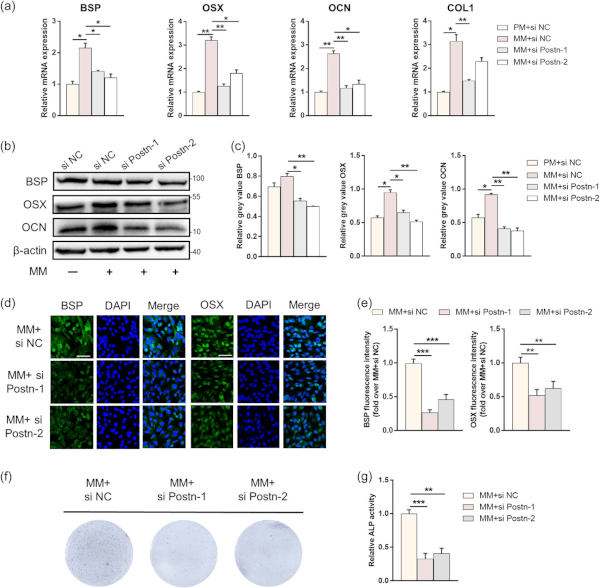 然后为了确定 Postn 对成牙骨质细胞矿化的影响,用针对 Postn 的 siRNAs(si Postn-1/2)或对照(NC)转染细胞。结果表明,诱导 4 天后,敲低 Postn 显著降低了 BSP、OSX、OCN 和 COL1 的基因表达(图3 a)。BSP、OSX 和 OCN 的蛋白质印迹分析以及 BSP 和 OSX 的免疫荧光染色表明,敲低 Postn 后,成牙骨质细胞矿化受到抑制(图3 b-e)。ALP染色和活性显示出类似效应(图3 f、g)。这些数据表明,敲低Postn在体外抑制了成牙骨质细胞矿化。此外,越来越多的证据表明,Postn对自噬具有调节作用。因此还研究了Postn对成牙骨质细胞自噬的影响,发现随着Postn的敲低,自噬上调。