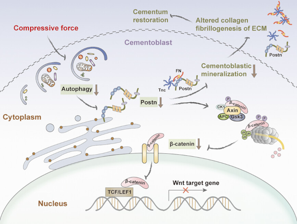总体而言,该研究数据提供了证据,证明自噬对于恢复体外和体内压缩力抑制的成牙骨质细胞矿化是必不可少的。研究进一步证明了自噬调节Postn的表达,并且Postn通过β-连环蛋白的泛素化部分调节成牙骨质细胞矿化。Postn/β-catenin轴的这种新发现的功能可以解释自噬如何在压缩力下介导成牙骨质细胞矿化,还确定了恢复牙骨质矿化和牙周组织再生的新治疗靶点。
