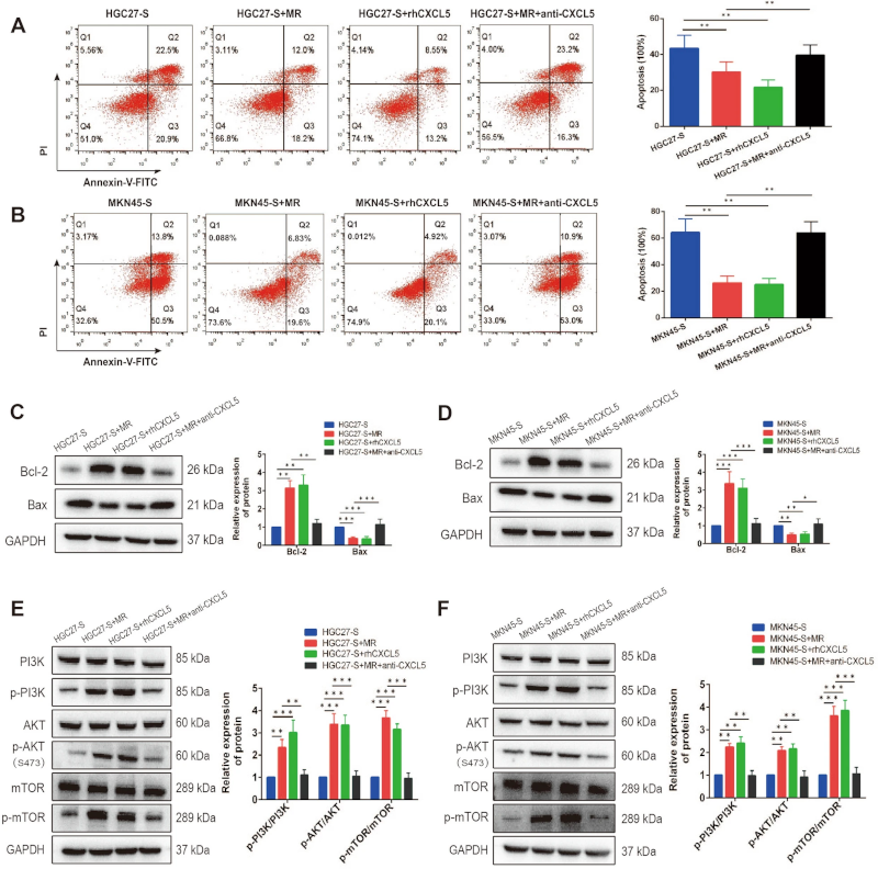越来越多的证据表明,对细胞凋亡的抵抗是导致化疗抵抗的原因。5-FU主要通过介导肿瘤细胞凋亡来发挥抗肿瘤作用。因此,实验想要确定 M2 极化巨噬细胞是否通过调节胃癌细胞凋亡介导 5-FU-抵抗性。结果表明,共培养MR巨噬细胞或rhCXCL5都可以降低凋亡比例,然而应用CXCL5中和抗体会降低MR巨噬细胞介导的胃癌细胞凋亡抵抗力(图3 A、B)。Western blot分析进一步表明,共培养MR巨噬细胞或添加rhCXCL5可增加Bcl-2的表达,降低Bax的表达,而CXCL5中和抗体可显著减弱这种效应(图3 C、D)。既往研究表明,PI3K/AKT/mTOR信号通路通过调节细胞增殖、凋亡和化疗抵抗在肿瘤进展中起关键作用。基于此,进一步研究了M2极化巨噬细胞对PI3K/AKT/mTOR通路激活的潜在影响,发现共培养MR巨噬细胞和rhCXCL5均能显著提高磷酸化的PI3K、AKT和mTOR的表达,而CXCL5中和抗体处理显著减弱这种激活该信号通路的能力。这些数据表明,M2极化巨噬细胞来源的CXCL5可抑制细胞凋亡,激活PI3K/AKT/mTOR通路,增加胃癌细胞5-FU-抵抗性。