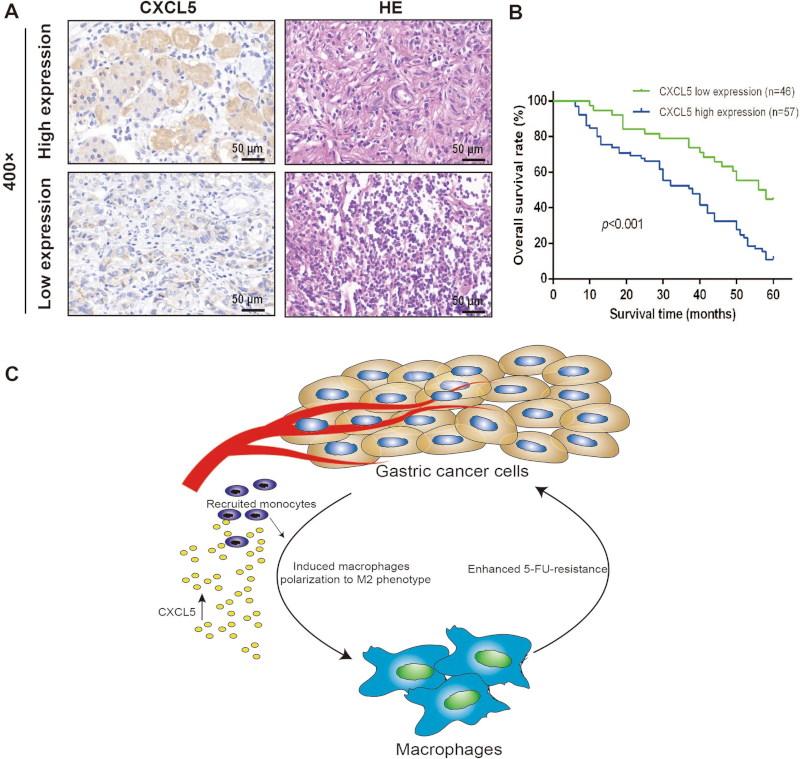 图4 CXCL5在胃癌组织中的高表达与患者的不良预后相关。(C)显示巨噬细胞如何与胃癌细胞相互作用以促进胃癌化疗抵抗微环境发展的图形摘要。