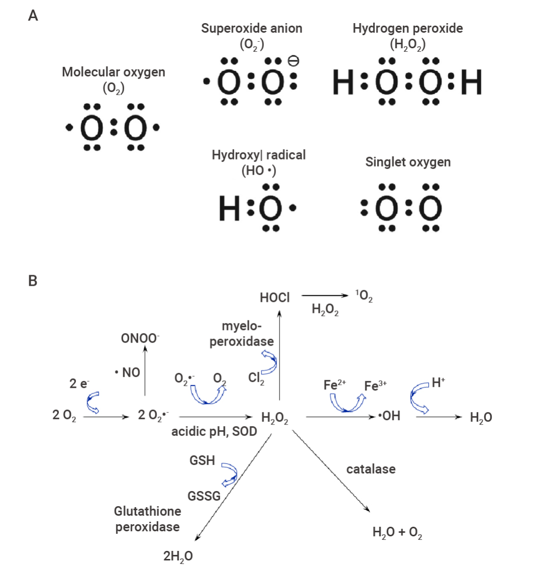 如图 1 所示,ROS 可以是中性分子,如 H2O2;离子,如超氧阴离子 O2•- ;或自由基,如羟基自由基•OH;当然也可以是单线态氧 1O2 。其中,羟基自由基•OH 为自由基,其余则为非自由基[1]。不同 ROS 的形成升高导致分子损伤,称为“氧化应激”。O2•- 由 O2 还原而成,是其他 ROS 的前体。例如,O2•- 分解形成 H2O2,H2O2 与亚铁化合物和相关还原剂发生 Fenton 反应或 Haber-Weiss 反应进一步还原为・OH[2][3]。