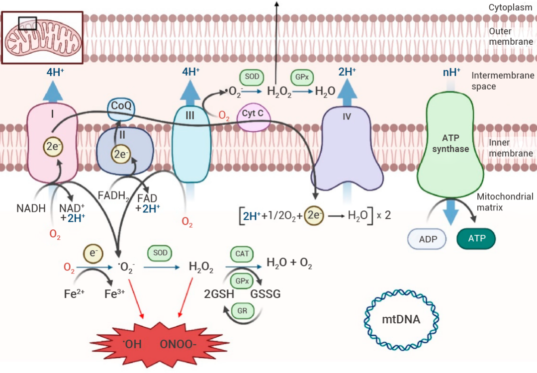 ROS 由各种细胞区室产生,包括细胞质、细胞膜、内质网、线粒体和过氧化物酶体。在这些区室中,线粒体是 ROS 产生的主要贡献者,它们产生了大约 90% 的细胞 ROS (图 2)[4][5]。在正常的氧代谢过程中,ATP 合成会产生 ROS。因此,在大多数情况下,ROS 被认为是呼吸作用的副产物。